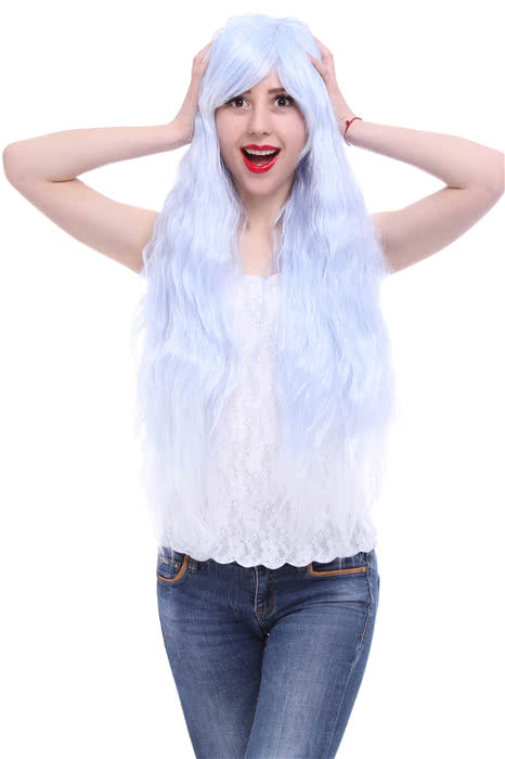 Fashion dames coaplay wig 90cm de long rhapsody sax bleu fondu to blanc bouclé les cheveux